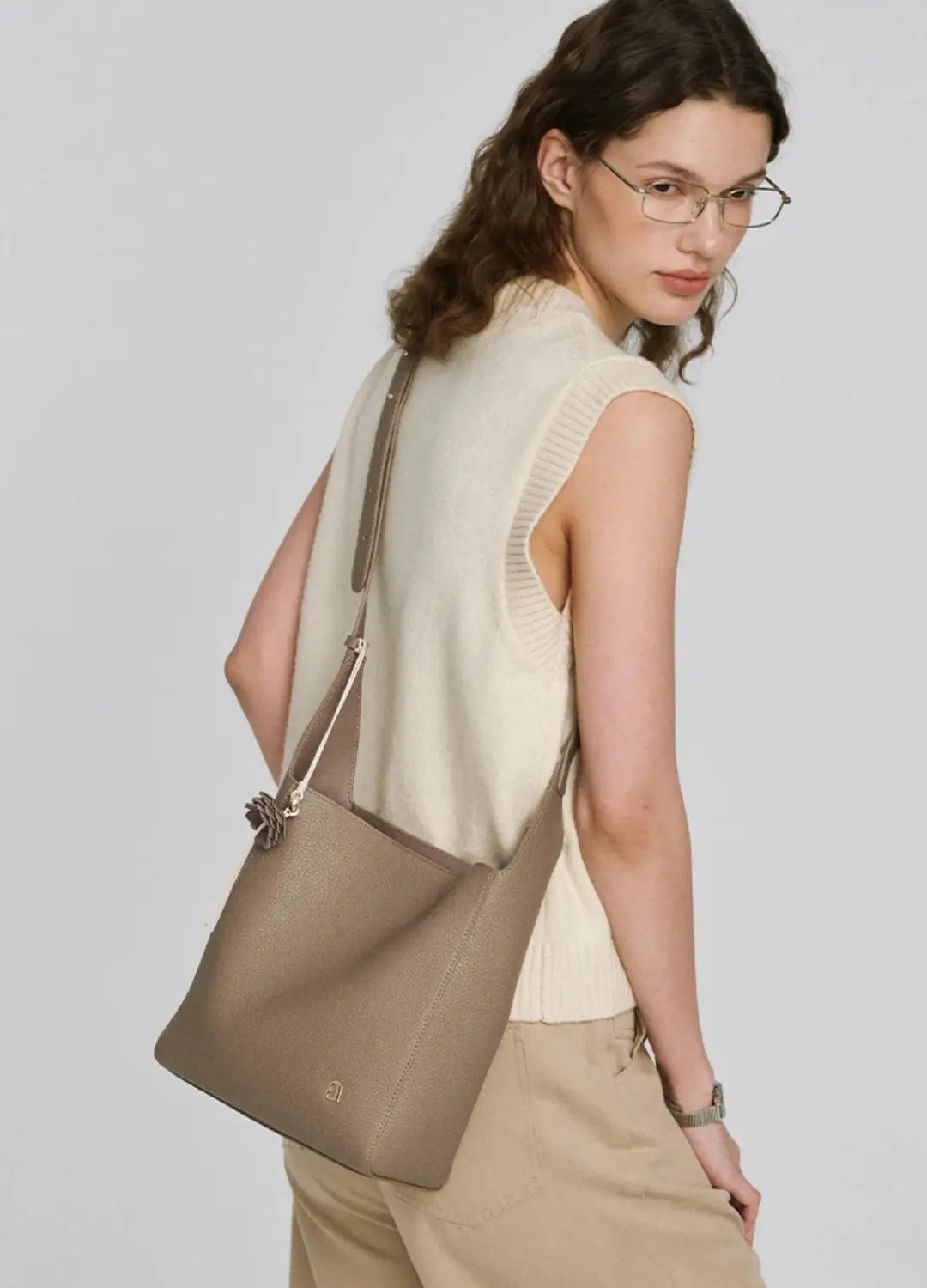 Seu formato tote em estrutura balde oferece volume interno generoso sem perder elegância visual.